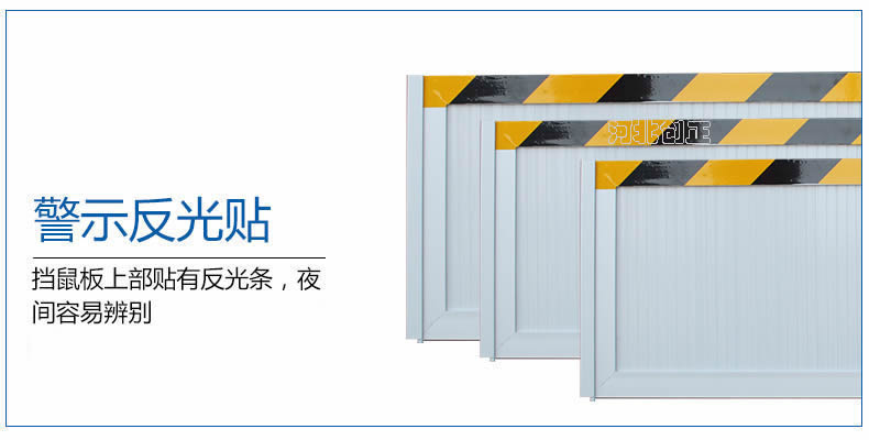 鋁合金擋鼠板接納鋁合金板材制做。擋鼠板上部貼黃黑相間反光條,反光條為反光膜加背膠紙建造。